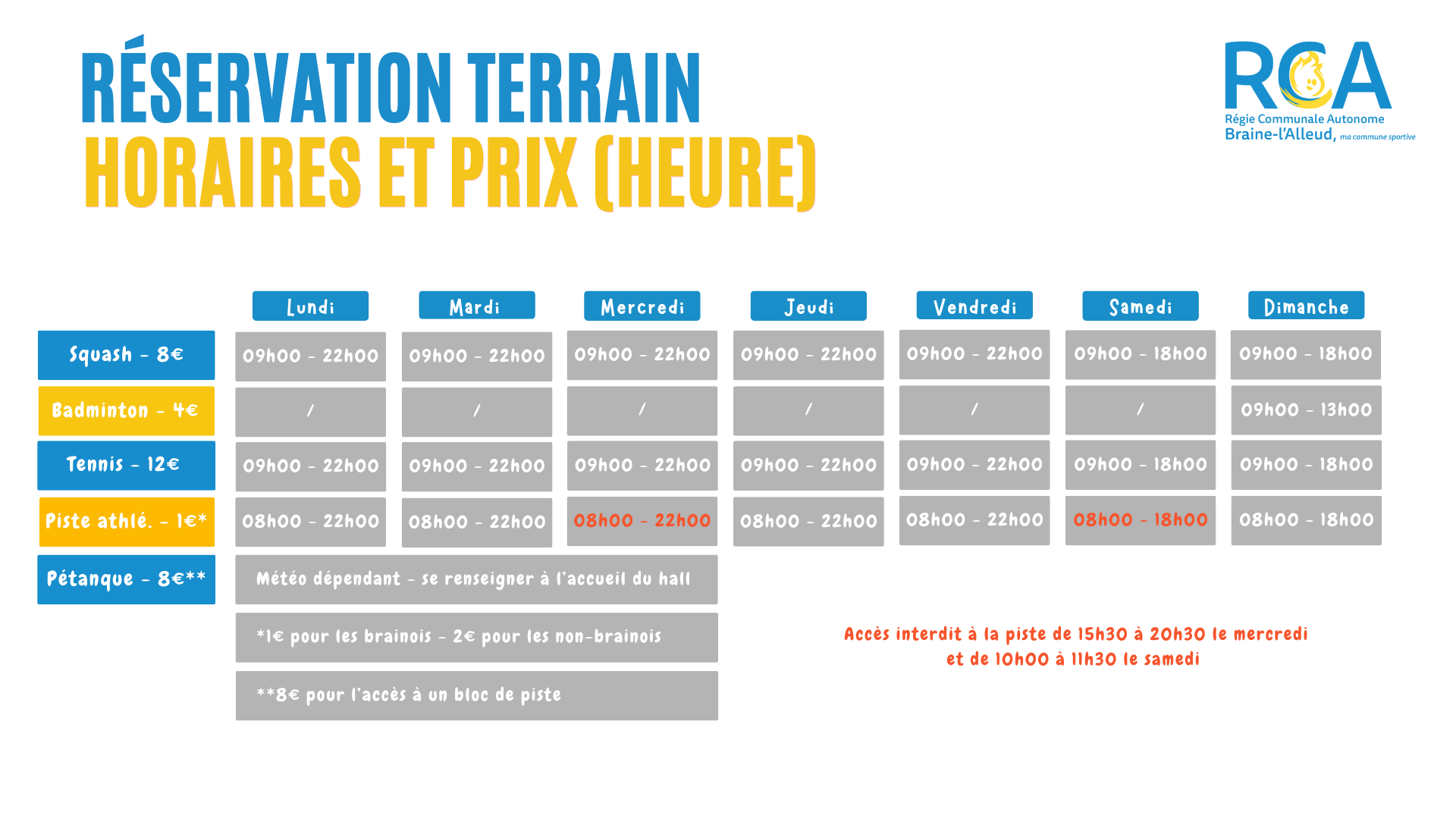 Pour réserver un terrain de tennis, squash ou badminton, vous devez passer par notre site de réservation ou notre application "BigCaptain" sur App store ou Play store.
